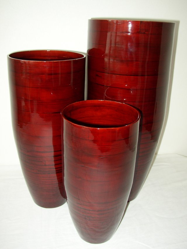 Váza vyrobená z přírodního bambusu. Bambus je štípán na tenké proužky a poté lepen, lisován a broušen do požadovaného tvaru. každý kus se tak stává originálem.