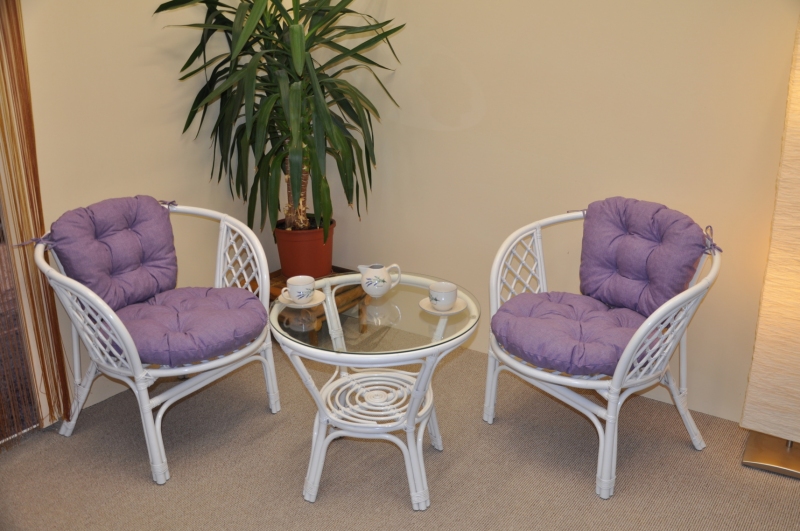 Ratanová sedací souprava Bahama bílá 2+1, polstry fialový melír