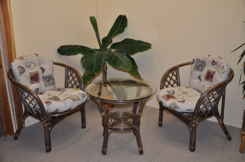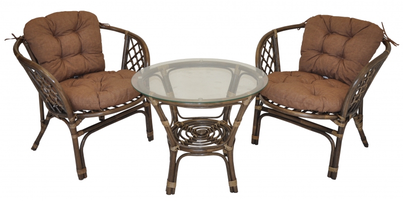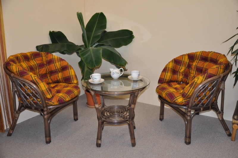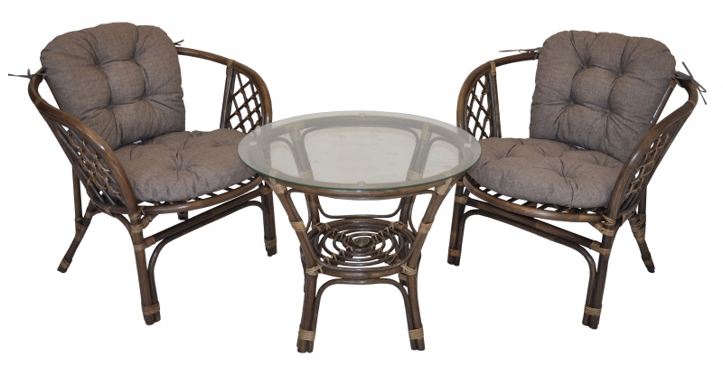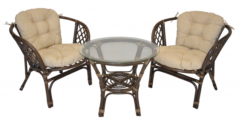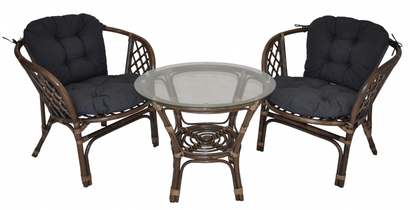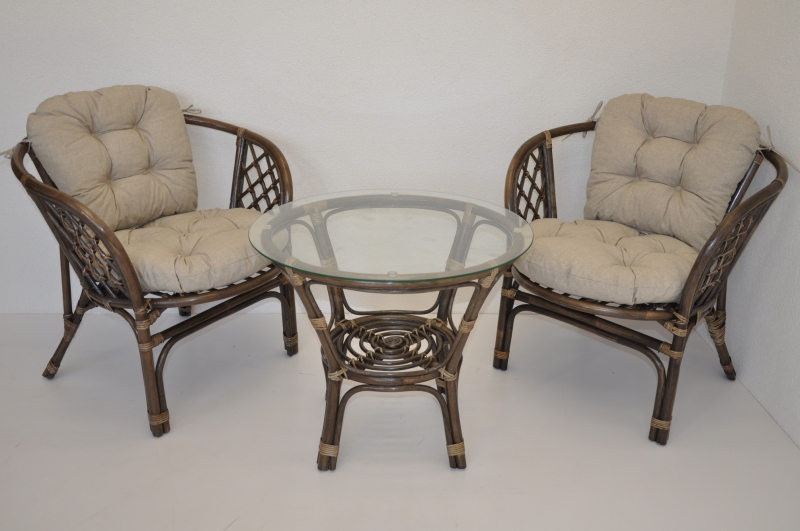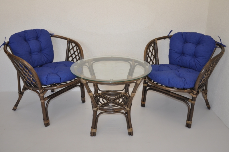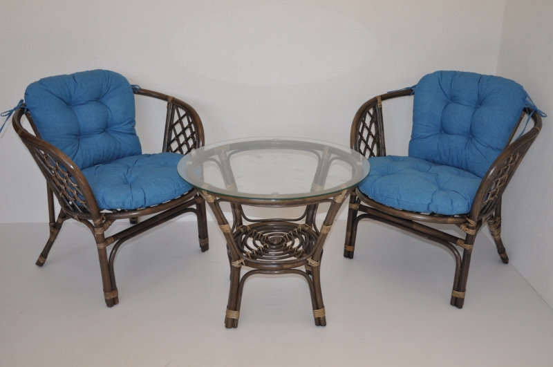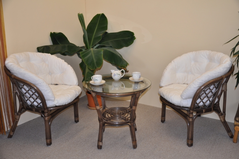 Ratanová sedací souprava Bahama se skládá ze dvou křesel, stolku se skleněnou deskou a kompletní sady polstrů.