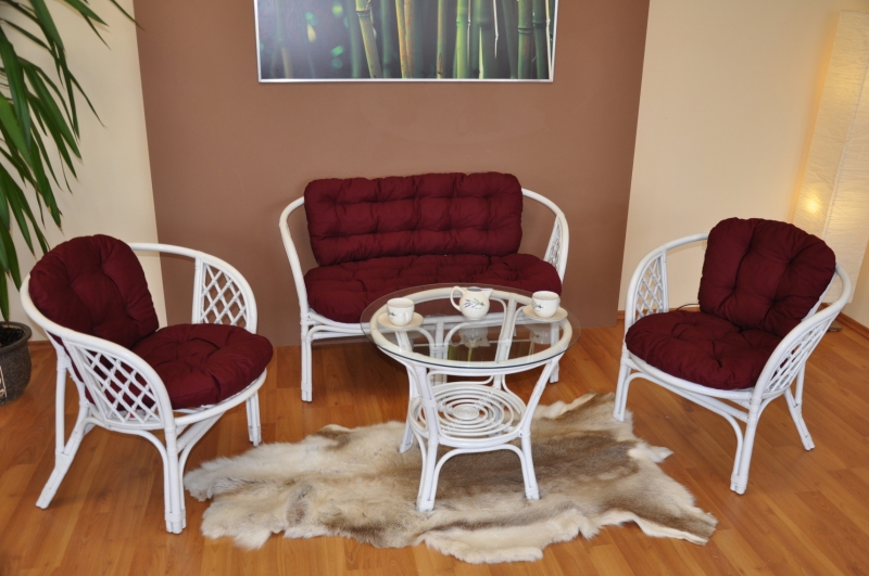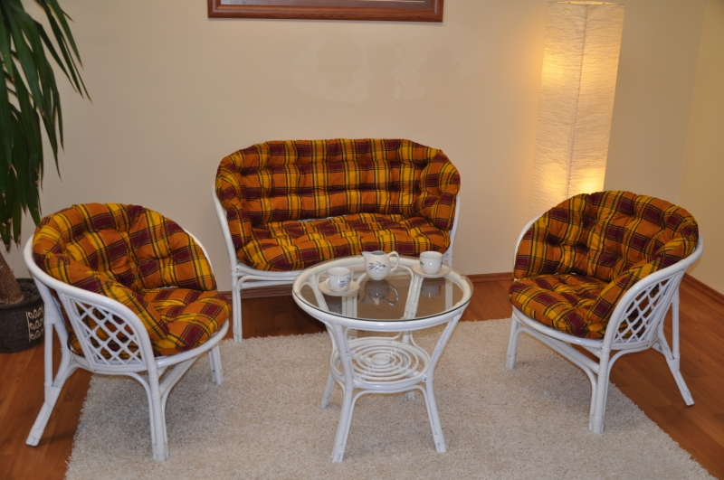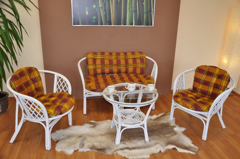 Ratanový nábytek - ratanová sedací souprava je vyrobena z přírodního ratanu s barvou konstrukce odpovádající fotografii výrobku,obsahuje lavici,2 křesla a stolek se sklem, kompletní sadu polstrů vyrobených v České republice.