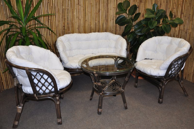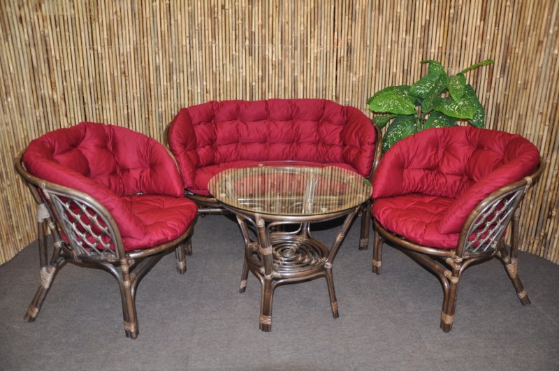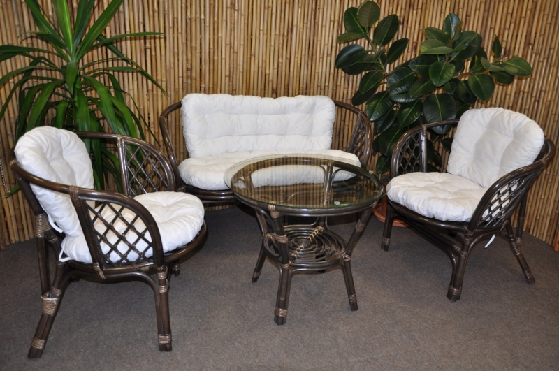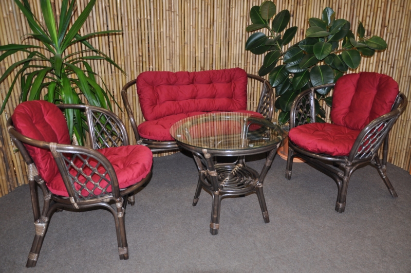 Ratanový nábytek - ratanová sedací souprava je vyrobena z přírodního ratanu s barvou konstrukce odpovádající fotografii výrobku,obsahuje lavici,2 křesla a stolek se sklem, kompletní sadu polstrů vyrobených v České republice