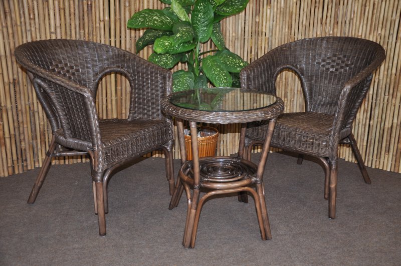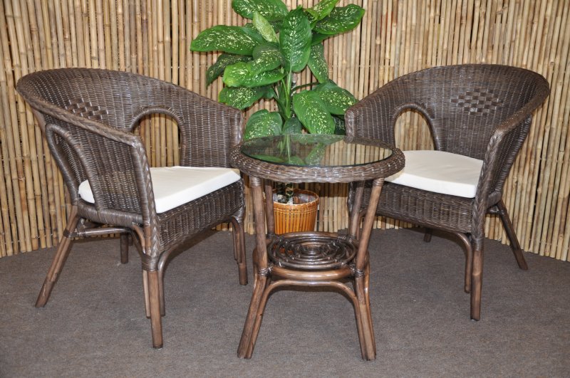 Ratanový nábytek - ratanová sedací souprava je vyrobena z přírodního ratanu v hnědé barvě konstrukce, souprava obsahuje 2 křesla a stolek se sklem, kompletní sadu polstrů