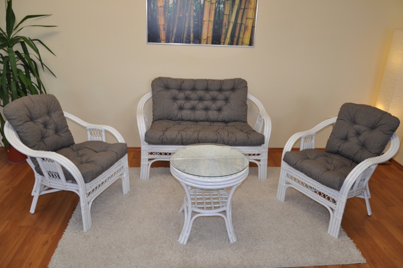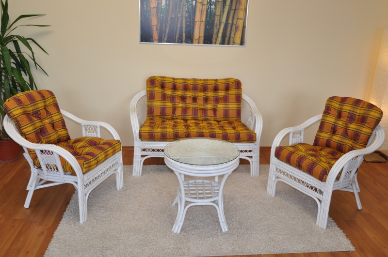 Ratanová sedací souprava je vyrobena z přírodního ratanu z masivních ratanových tyčí. Součástí soupravy je pohovka, 2 křesla, stolek a sada polstrů.