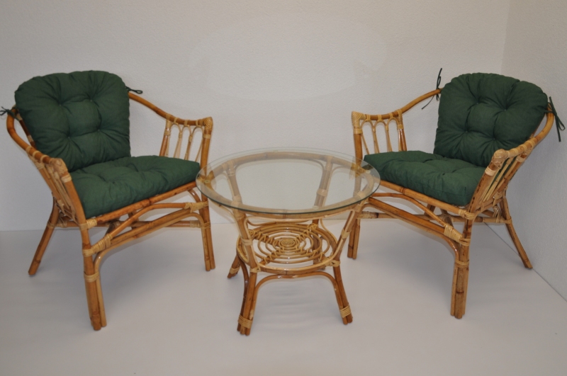 Ratanová sedací souprava Subaliu se skládá ze dvou křesel, stolku se skleněnou deskou a sady polstrů.